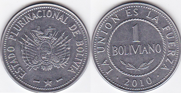 Moneda: 1 Boliviano (Bolivia) (1864~2010 - República de ... : Actualmente Están En Circulación Las Monedas De 10, 20 Y 50 Centavos, Y De 1, 2 Y 5 Bolivianos.